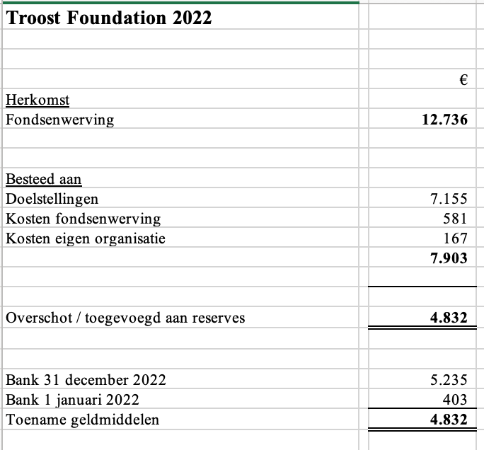 Na missie reizen naar Roemenië, Oekraïne, Tanzania, Ethiopië en Zuid-Afrika is het verlangen ontstaan om jaarlijks noodgebieden te bezoeken om daar ook onze achternaam waar te maken. We hebben gemerkt dat muziek, onderwijs, gebed en ontmoeting mensen op een bijzondere manier kan aanmoedigen om vol te houden in het geloof. De stichting Troost Foundation is ontstaan om deze missiereizen mogelijk te maken. De stichting heeft een onafhankelijk bestuur en komt elk half jaar samen om de voortgang te bespreken.
