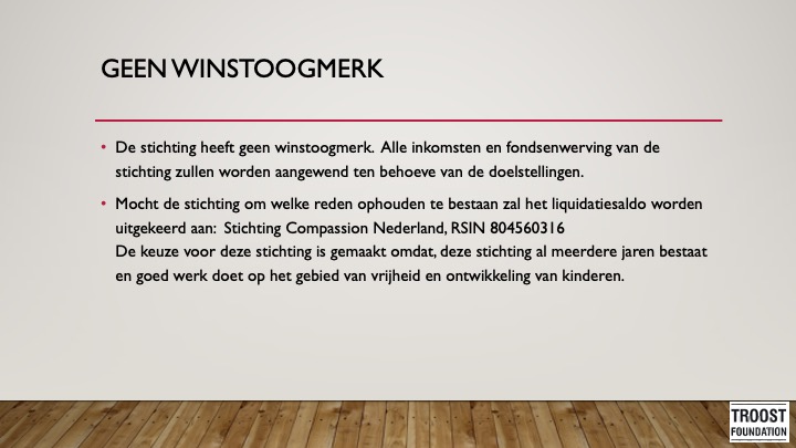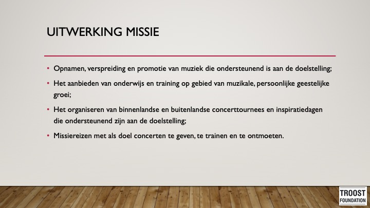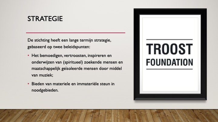 Na missie reizen naar Roemenië, Oekraïne, Tanzania, Ethiopië en Zuid-Afrika is het verlangen ontstaan om jaarlijks noodgebieden te bezoeken om daar ook onze achternaam waar te maken. We hebben gemerkt dat muziek, onderwijs, gebed en ontmoeting mensen op een bijzondere manier kan aanmoedigen om vol te houden in het geloof. De stichting Troost Foundation is ontstaan om deze missiereizen mogelijk te maken. De stichting heeft een onafhankelijk bestuur en komt elk half jaar samen om de voortgang te bespreken.